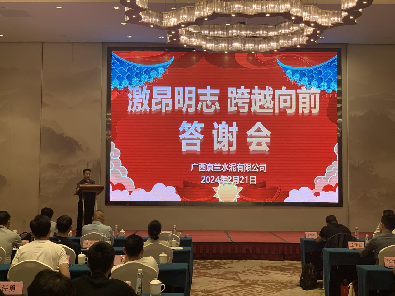 2024年2月21日,廣西京蘭水泥有限公司在柳州蓮花山莊召開(kāi)以“激昂明志,跨越向前”為主題的2023年度代理商年終總結(jié)大會(huì)暨答謝會(huì),共有來(lái)自兩廣各地近20個(gè)地市、40余位合作代理商參加了本次盛會(huì),會(huì)議在熱情洋溢的氛圍中成功舉辦。